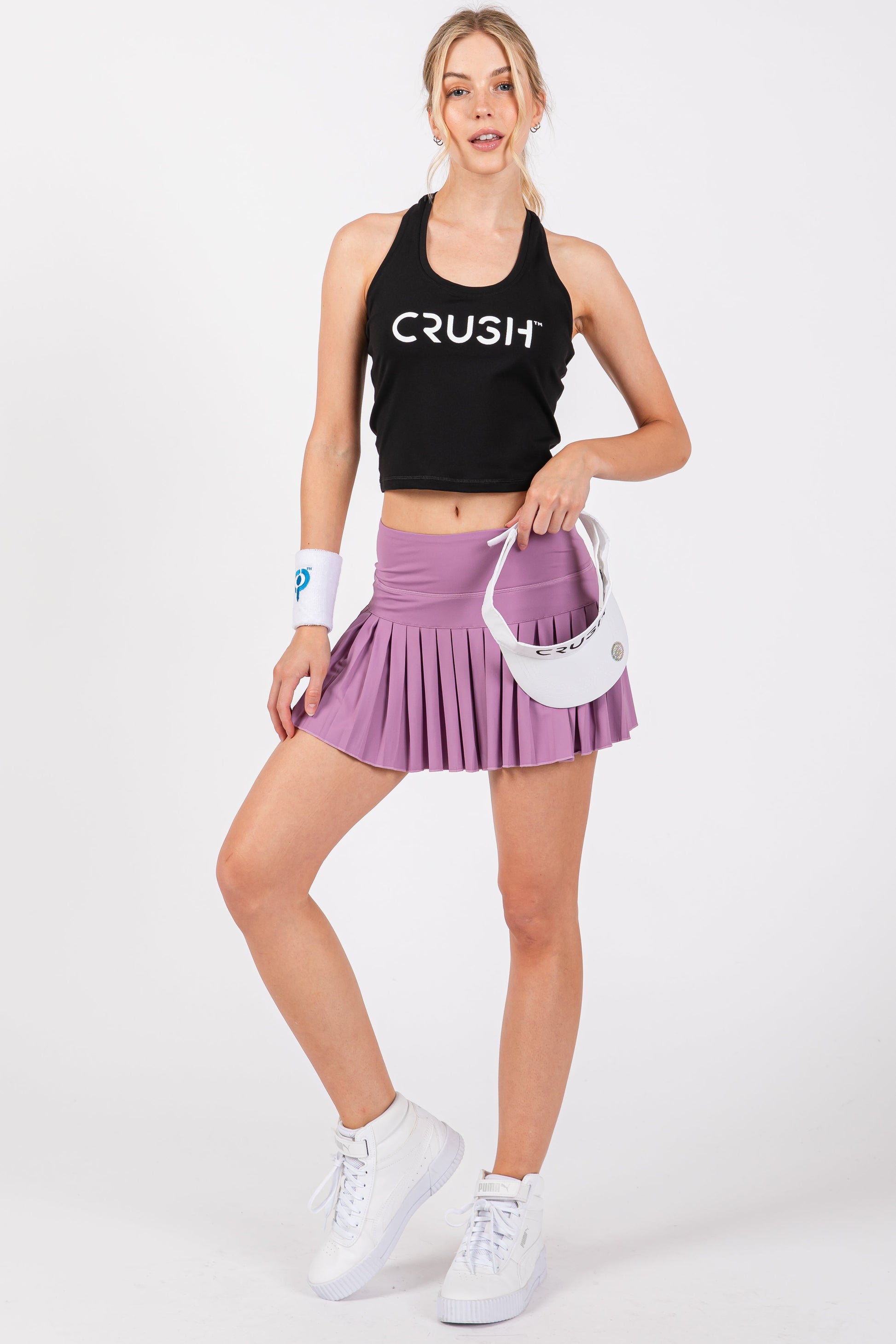 CRUSH racerback tank (available in 2 colors). This tank is form fitting, moisture wicking and breathable with a 4 way stretch and very durable. The material is not see through and fits like a glove. This tank gives you the chance to focus on the court and keeps you looking good! This tank comes in alpine white and ebony black.